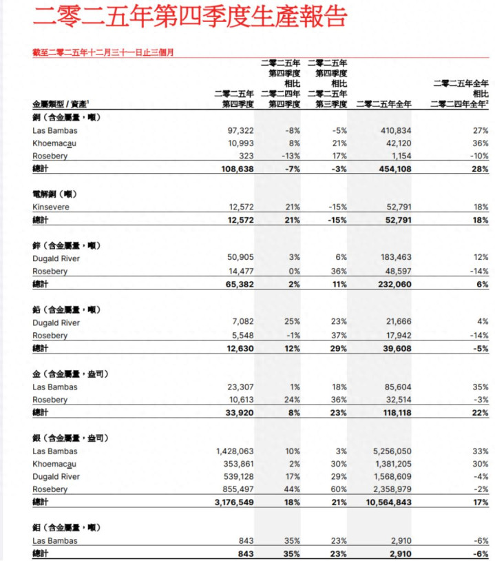 铜板块,五矿资源铜产量(含电解铜)50.7万吨,同比增长27%,创下2018年以来新高。其中核心矿山,位于秘鲁的拉斯邦巴斯铜矿2025年创下投产以来的第二高纪录,达到41.08万吨,同比增长27%。
